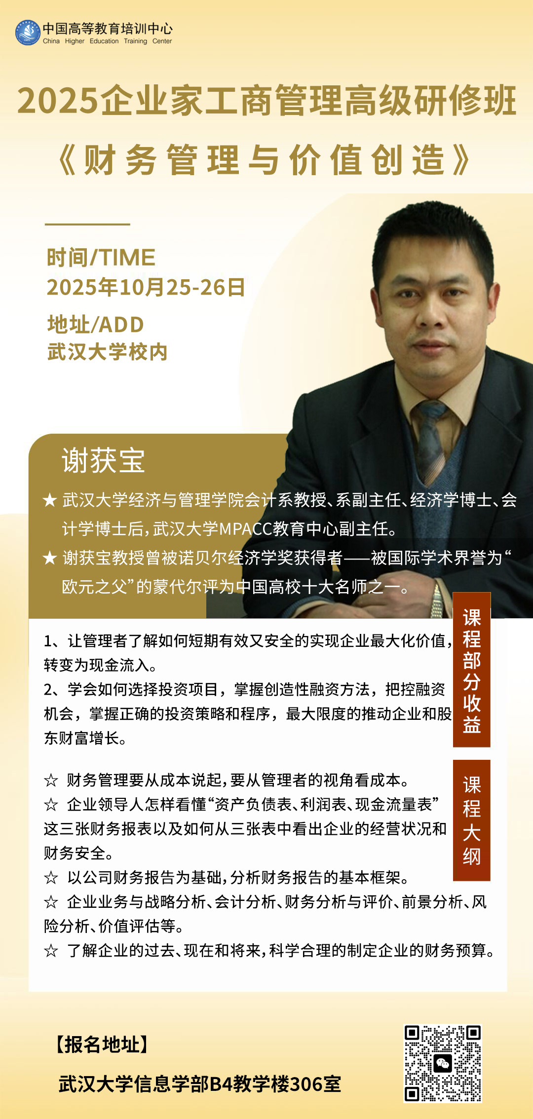 - 工商管理总裁班《财务管理与价值创造》课程时间:10月25-26